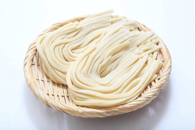 Udon (饂飩) is the thickest of Japanese noodles. White in color and made from wheat, they can be served either hot or chilled with dipping sauces, in broth, or in an array of other hot dishes. Udon is usually topped with various ingredients like mixed tempura fritters (kakiage), deep fried tofu pockets (aburaage), tempura, or prawn. Some examples of udon dishes include curry udon, kitsune udon, and yakii udon. A thin slice of fish cake (kamaboko) usually completes the dish.