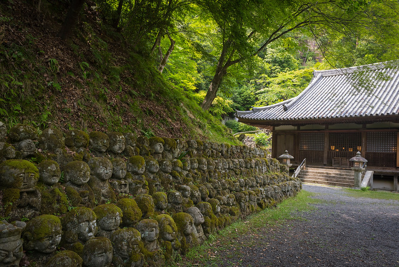 Arashiyama in Kyoto, also known as the mountain across the Ōi River, is a nationally designated Historic Site and Place of Scenic Beauty (a collective term used by the Japanese government’s Law for the Protection of Cultural Properties to denote Cultural Properties of Japan.) Found in the quiet Arashiyama neighborhood is Otagi Nenbutsu-ji, a Buddhist temple that is most unique. Otagi Nenbutsu-ji was founded by Empress Kōken, also known as Empress Shōtoku, the 46th Empress of Japan. She reigned as Empress Kōken from 749 to 758.